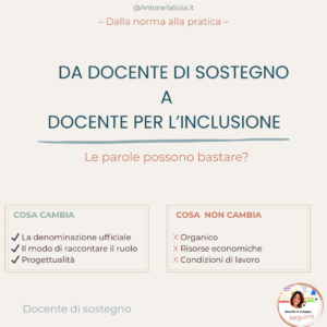 La sostituzione della denominazione docente di sostegno con docente per ➡️ l’inclusione non comporta modifiche all’organico, né introduce nuovi investimenti o cambiamenti nelle condizioni di lavoro.