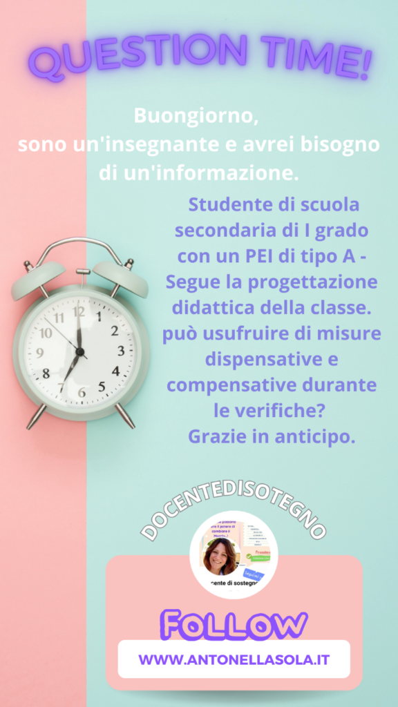 Buongiorno, sono un’insegnante e avrei bisogno di un’informazione. Se uno studente di scuola secondaria di I grado presenta un PEI di tipo A – Segue la progettazione didattica della classe e si applicano gli stessi criteri di valutazione – può usufruire di misure dispensative e compensative durante le verifiche o le stesse devono essere identiche a quelle del resto della classe? Grazie in anticipo. Chiedo perché ho ricevuto opinioni contrastanti